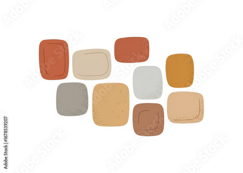 geometric shape, illustration, background, pattern, element, design, composition, artwork, hand-drawn, minimalist, modern, contemporary, simple, rounded, soft, textured, flat, organic, arranged, grouped, isolated, overlapping, terracotta, brown, beige, grey, ocher, muted, calm, gentle, natural, tranquil, serene, white background, artistic, abstract art, collage, graphic, web design, decor, creative, professional