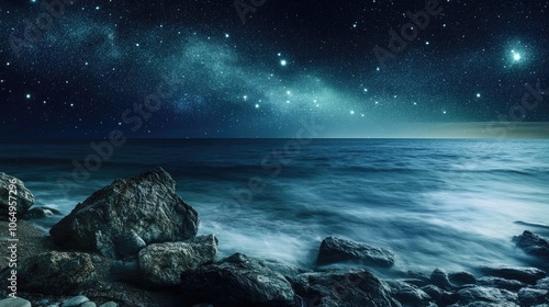 Abstract panorama of a surreal seascape captured with a long exposure technique to enhance the night seascape theme, offering a dreamlike quality and ample copy space.
