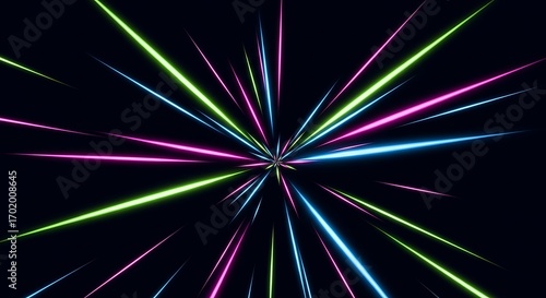 abstract, radiating, line, neon, colours, vibrant, bright, colourful, dynamic, energy, starburst, exploding, motion, speed, fast, light, glow, pattern, geometric, symmetric, central, dark, black, background, pixelated, digital, art, graphic, design, visual, effect, technology, futuristic, hypnotic, hallucinogen, laser, streak, intense, projection, ray