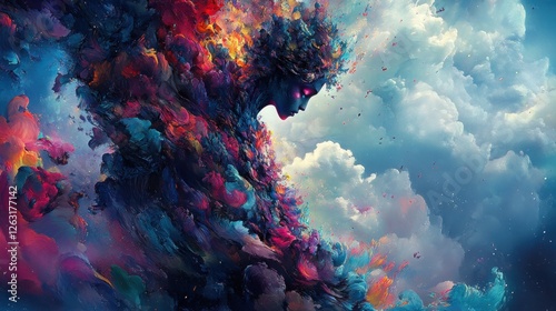 Abstract Representation of a Colorful Entity Emanating Emotion Amidst Dramatic Clouds