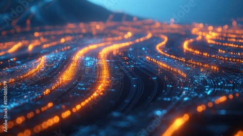 datum, flow, technology, abstract, digital, network, visualisation, light, pattern, wave, motion, energy, design, graphic, innovation, connectivity, information, speed, aesthetic, blue, orange, futuristic, creative, surface, texture, environment, line, illumination, concept, dynamic, art, simulation, cyber, landscape, depth, perspective, aglow, fluid, rythm, structure, representation, system, complexity, interaction, vibrant, cybernetic