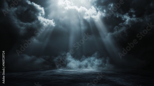 Abstract scene with dark clouds and light rays illuminating fog at night for product showcase