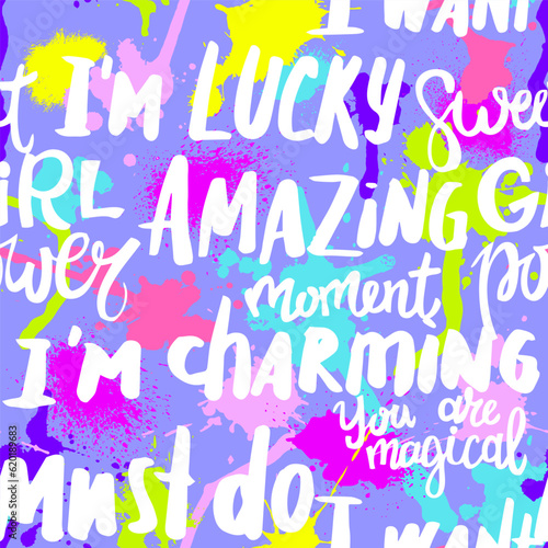 Abstract seamless chaotic pattern with paint spots and words. Grunge neon texture background. Print for girls. Fashion style