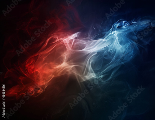 Abstract smoke art with red and blue ethereal wisps meeting in the middle against black background, creating dynamic contrast between warm and cool tones in this artistic vapor photography.