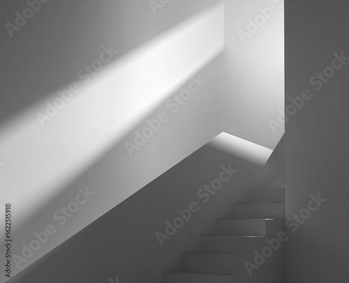 staircase, interior, architecture, light, shadow, modern, minimalist, white, grey, empty, hallway, corridor, perspective, step, sunlight, bright, design, contemporary, geometric, simple, modern architecture, interior design, shadowy, beam of light, soft light, empty space, smooth, industrial, concrete, abstract
