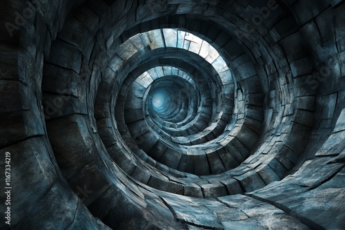 spiral, tunnel, stone, abstract, architecture, dark, light, block, texture, pattern, design, background, grey, blue, perspective, depth, three, dimensional, geometry, shape, form, curved, line, construction, rock, wall, surface, material, cold, mysterious, endless, infinite, journey, way, path, destination, exploration, discovery, mystical, surreal, visual, art, image, graphic