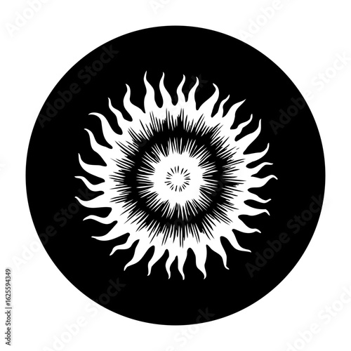 sun, radiant, energy, burst, abstract, illustration, modern, contemporary, artwork, black, white, graphic, ray, circle, solar, light, heat, flare, design, decorative, celestial, cosmic, space, astrology, symbol, element, nature, power, vibrant, glowing, star, explosion, astronomic, plasma, luminance, burning, bright, center, dynamic