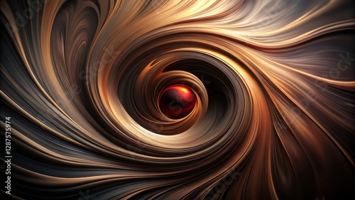 Abstract swirling vortex of bronze and gold hues encompassing a central red sphere