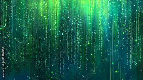 Abstract tech background featuring overlapping layers of transparent blue and green data grids with floating geometric shapes and binary code. cyber tech wallpaper. Floating Lights. Illustration