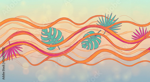 Abstract tropical design with colorful leaves and flowing waves
