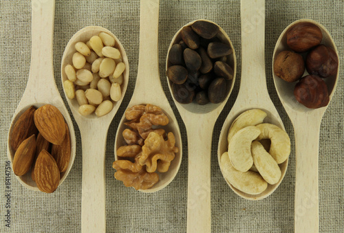 abstraction, spoon, teaspoon, pine nut, almond, cashew, hazelnut, walnut, nut, natural, grey, background, fabric, textile, linen, kitchen utensile, health food, health, raw food