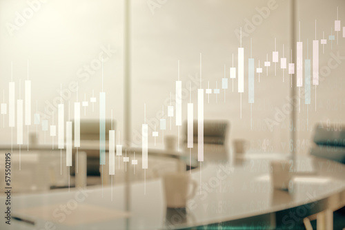 Abstract virtual financial graph hologram on a modern furnished classroom background, financial and trading concept. Multiexposure