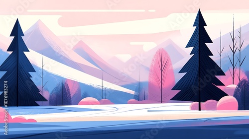 Abstract Winter Landscape with Pink Trees and Mountains