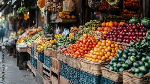 Abundance of Fresh Produce at an Outdoor Market Display with Various Fruits