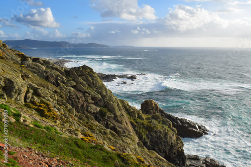 Acantilados y olas rompiendo contra las rocas en un día soleado parcialmente nublado en la costa atlántica de Galícia, España.