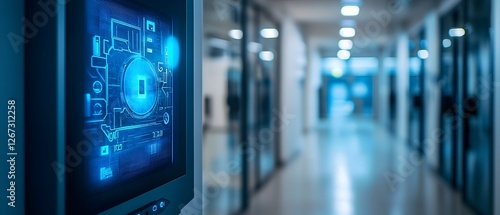 Access Detection Gadgets, Futuristic Access Control Panel with Glowing Blue Holographic Display in Blurred Hallway