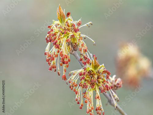Acer negundo, Box elder, boxelder, ash-leaved and maple ash, Manitoba, elf, ashleaf maple male inflorescences and flowers on branch outdoor.
