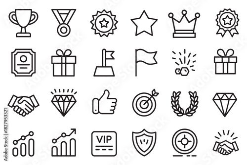 award, trophy, medal, badge, crown, star, prize, gift, flag, target, success, victory, diamond, certificate, handshake, vip, shield, icon, outline, ranking, premium, quality, achievement, goal, winner