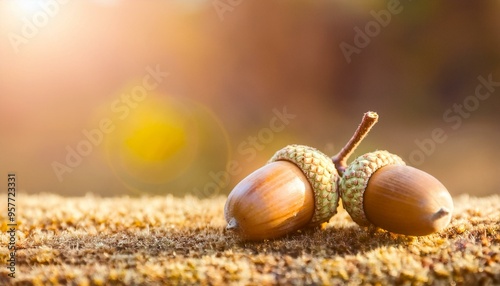 Acorn close-up. Oak fruit, warm sunlight