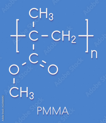 Acrylic glass or poly(methyl methacrylate), chemical structure. PMMA is the component of acrylic paint (latex) and acrylic glass. Skeletal formula.