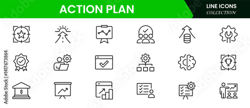 Action plan icon set. Containing planning, schedule, strategy, analysis, tasks, goal, collaboration, and objective icons. Vector illustration collection.