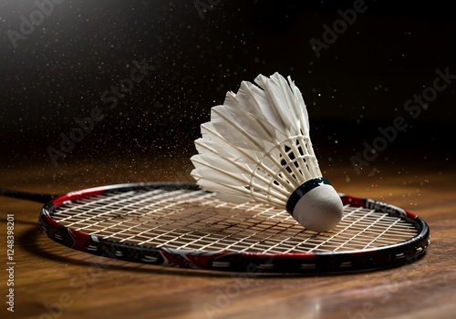 badminton, shuttlecock, racket, sport, action, sports equipment, competition, game, mid-air, flying, dust, motion, closeup, detail, wooden floor, dark background, white, red, black, athletic, competitive, active, professional, equipment, accessory, exercise, fitness, healthy lifestyle, high speed, aerodynamic, tournament, practice, training