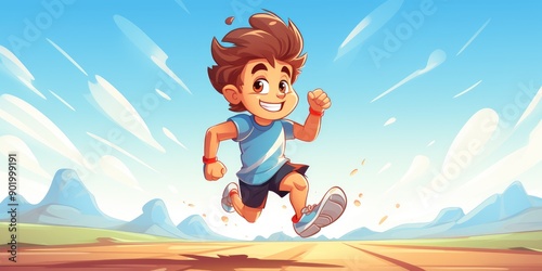 active energetic player boy running fast and jumping while speed training or playing a match, dynamic active pose of kids and children success in sports championship in cartoon style background