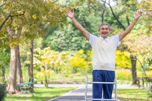 fresh air, enjoying, arm, widener, encourage, activity, active, smile, asian, happy, portrait, adult, older, elderly, aged, senior, people, old, support, health, retirement, man, patient, walker, walk, male, park, lifestyle, physical, health care, weakness, nature, help, medicals, recovery, rehabilitation, green, movement, exercise, muscle, longevity, aid, recreation, disease, accident, practice, paralysis