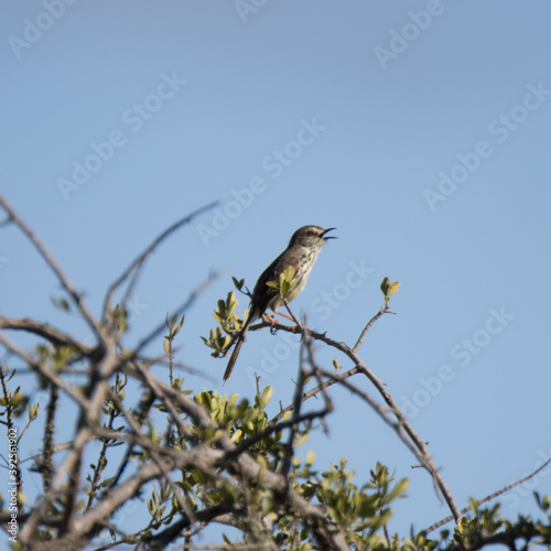 Addo Elephant National Park: Karoo prinia perched in tree singing to proclaim its territory