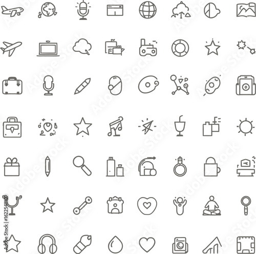 con, vector, black, white, outline, vignetting, illustration, drawing, travel, aeroplane, suitcase, globe, tree, nature, camera, microphone, pen, pill, star, gift, magnifier, nubes, earphones, compass, education, tech, symbol, lifestyle, minimal, graphic, hand-drawn, set, creative, simple, design, decorative