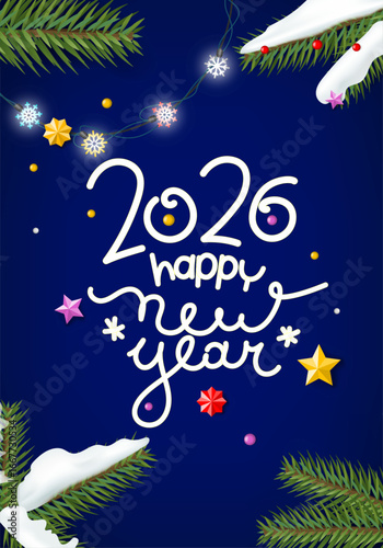 vector, 2026, vertical, blue, confetti, holiday, new year, accessory, element, festive, party, wishes, greeting, winter, tree branch, pine, christmas tree, decor, frame, wood, top, arrangement, romantic, wallpaper, garland, space, copy space, snowflake, creative, concept, layout, design, template, topview, trendy, merry, vintage, season, vacation, celebration