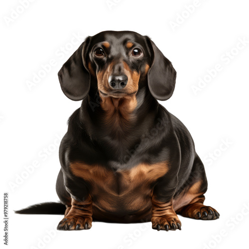 Adorable and curious overweight Dachshund dog with brown fur looking at camera while sitting and isolated against transparent background, png file.