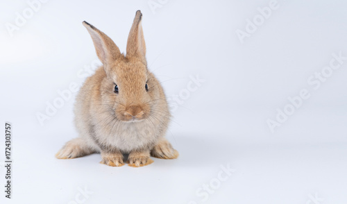 Adorable baby rabbit bunnies brown looking at something sitting over isolated white background. Puppy lovely furry infant brown bunny ears rabbit playful with copy space. Easter bunny animal concept.
