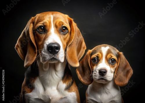 Adorable Beagle Puppy and Adult Beagle Dog Posing on Black Background - Isolated Stock Photo
