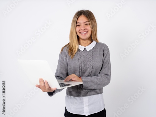 Adorable Beautiful teen girl wearing grey sweater holding modern device