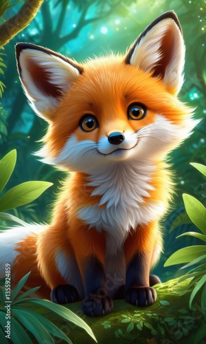 adorable, cartoon, fox, forest, lighting, vibrant, greenery, cute, animal, timberland, nature, foliage, character, illustration, art, digital, fluffy, playful, fantasy, magical, whimsical, expression, big, eye, tail, fur, orange, high-coloured, bright, sunlight, leaf, peaceful, serene, enchanting, charme, friendly, innocent, joyful, fun, creative, imagination, natural, curious, exploring, daytime, calm, tranquil, beauty