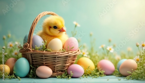 Adorable chick sitting in a woven basket filled with pastel-colored Easter eggs surrounded by daisies