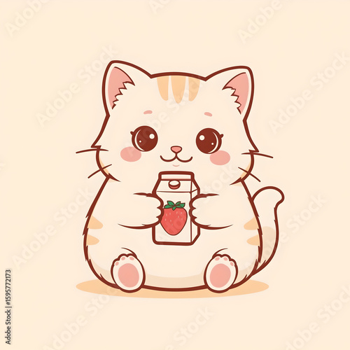 Adorable Chubby Cartoon Cat with Strawberry Milk Carton