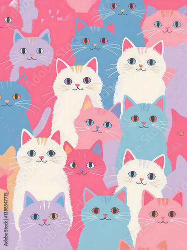 Adorable Colorful Cats in Pastel Shades on Pink Background – Whimsical Kawaii Style Illustration