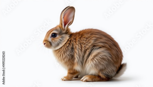 Adorable fluffy rabbit with soft fur sitting gracefully against a clean white background, showcasing its charming features and curious gaze