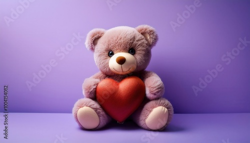 Adorable Fluffy Teddy Bear Holding a Red Heart, Set Against a Soft Purple Background, Representing Love, Affection, and Warmth. Perfect for Valentine's Day, Friendship, or Gift Themed Concepts