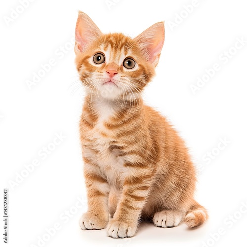 kitten, tabby, ginger, cat, pet, animal, cute, adorable, felino, domestic, small, young, mammal, studio, white background, sitting, looking up, eye, curious, bright, light, orange, striped, portrait, isolated, 1, innocence, innocent, soft, fur, fluffy, paw, whisker, meow, carnivore, baby, playful, companion, friendship, purebred, pedigree, domestic cat