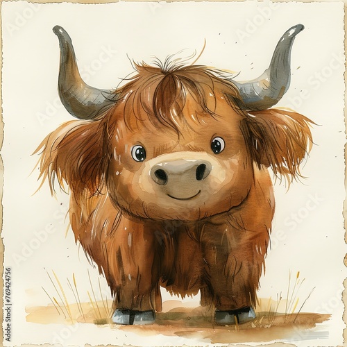 highland cow, illustration, watercolor, adorable, cosy, charming, artwork, farm animal, fluffy, cattle, bovine, rustic, animal portrait, artistic, country life, furry, farm animal, hand-drawn, innocence, warm colors, endearing, pastoral