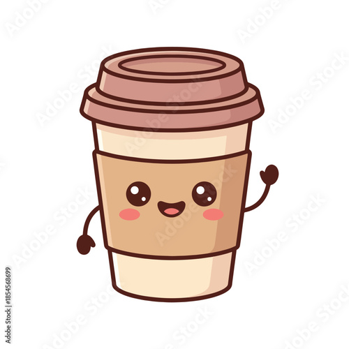 Adorable kawaii coffee cup character illustration with a friendly waving gesture, perfect for a cheerful morning beverage design concept conveying warmth and welcome