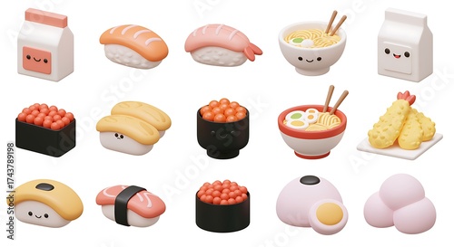 sushi, cute, food, illustration, isometric, cartoon, japanese food, ramen, drink, snack, dessert, set, collection, design, graphic, vector, digital artwork, adorable, playful, whimsical, epicure, tempting, delicious, appetising, stylised