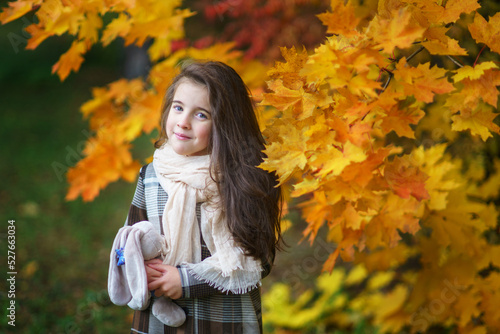 adorable little girl with autumn leaves in the beauty park