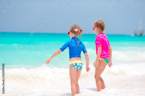 Adorable little girls at beach having fun in shallow water during summer vacation