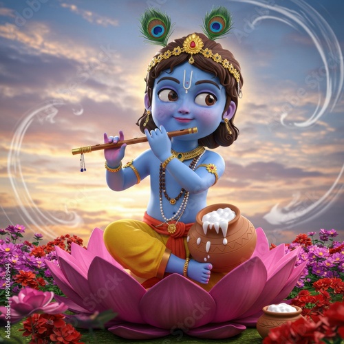 krishna, flute, lotus, children, god, hindu, indian, mythology, religion, spiritual, peace, serenity, calm, calmness, divine, adorable, cute, innocent, sweet, beautiful, art, three-dimensional, render, digital, illustration, fantasy, sunset, sky, cloud, flower, nature, culture, tradition, belief, devotion, faith, holy, milk, pot, peacock, feather