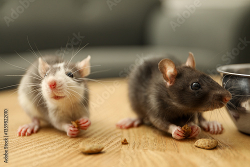Adorable little rats eating food on wooden surface indoors, closeup