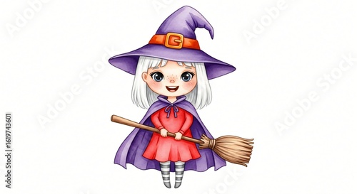 Adorable Little Witch Girl with Purple Hat and Broom Halloween Cartoon Illustration